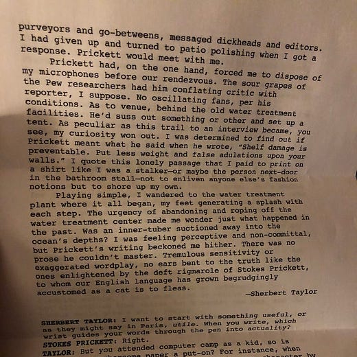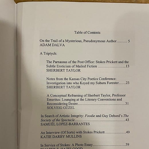 Of course, it's possible that “Stokes Prickett” chose to self-publish a manuscript and send it to a select group of people who he/she/they believed would talk about him/her/them (“If you got one,” “Prickett” explained to the New Yorker’s Adam Dalva, “it’s because I liked something you wrote. It could be anything from a critical tome to a tweet”).