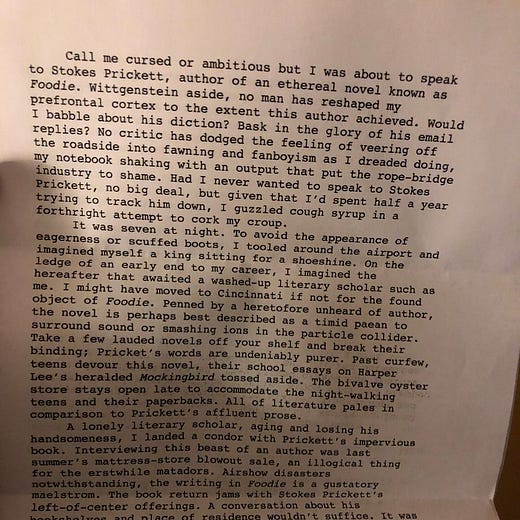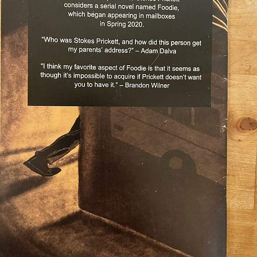 But given how little anybody ended up actually talking about Foodie since its 2020 release, I consider this premise unlikely. It’s more likely—or at least, this is the narrative I choose to believe—that “Stokes Prickett” is a published author who grew weary (and wary) of sacrificing writing-time to become a “content creator,” which their agent/publisher insisted was the only way to remain relevant to the algorithms in pursuit of literary fame. An even more logical scenario is that we take Foodie at face value: a mysterious, humble, explicitly not-for-profit story about one American writer’s disillusionment with, as Foodie’s subtitle makes clear, the “capitalist monsoon.”