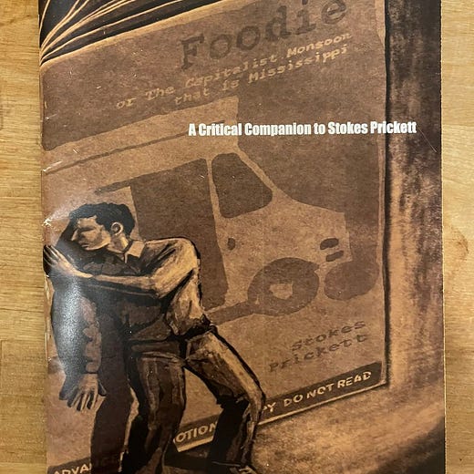 Despite this, and to this day, it remains impossible to read Foodie, or, The Capitalist Monsoon that is Mississippi unless “Stokes Prickett” wants you to … and what a gift to be reminded that